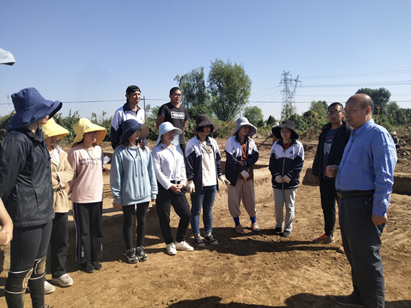 在鹤壁市淇滨区辛村福兴寺遗址的考古工地,此次发掘项目的执行领队河南省文物考古研究院高振龙博士带领常书记等一行人参观了发掘现场,带队老师和学生向领导老师们介绍了考古实习的基本情况。每到一处,领导老师们都详细了解学生的工作、生活情况,听取了实习生的收获、体会及建议。