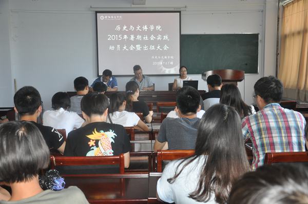 7月1日,历史与文博学院2015年暑期社会实践动员大会暨出征大会于和鸣B211举行,出席本次会议的领导有院党委副书记祁欢、副院长李彦雄、学工办主任李建平,会议由学院分团委负责人常阳主持,学院2015年暑期社会实践队队员及各班班长、团支书参加了此次会议。