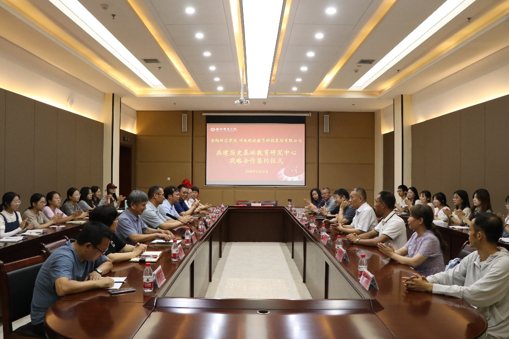2024年6月18日,安阳师范学院与河南绽放教育科技集团有限公司共建历史基础教育研究中心战略合作签约仪式于文博南楼一楼中厅会议室顺利召开。河南绽放教育科技集团有限公司总经理李暮、学科顾问申建民一行莅临我校进行合作交流。安阳师范学院副校长杜记民、教务处处长肖建清、我院领导班子成员、师生代表参加签约仪式,安阳市教育局基础教研室徐华东、安阳市省级教学名师代表应邀出席。会议由我院党委书记徐永杰主持。
