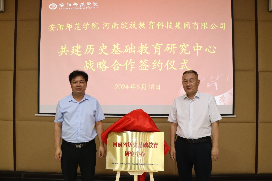 我院李彦雄院长致欢迎辞,对李暮一行人的到来表示热烈欢迎,详细介绍了我院的办学历史和在人才培养、学科建设方面取得的成就以及我院师范教育教学改革的目标,并希望以此次签约仪式为纽带,打通企业、高校、中学基础教育三个环节,打造“资源共享、共创共建、优势互补、推动发展”的合作交流平台。河南绽放教育科技集团有限公司总经理李暮围绕中学教育改革及新高考改革进行的现状,说明了课程资源整合的必要性,提出动态、立体、贯通、融合的资源整合方向,表达了与安阳师范学院开展战略合作的强烈意愿。安阳市教育局基础教研室徐华东表示,安阳师范学院与河南绽放教育科技集团有限公司进行交流合作,利于推进双方科研力量的优化配置和资源共享,推动历史教学研究及基础教育改革发展,为河南省历史基础教育作出卓越贡献。仪式上,院长李彦雄与总经理李暮签署合作共建协议。教务处处长肖建清与河南绽放教育科技集团有限公司学科顾问申建民共同为中心揭牌。最后,安阳师范学院副校长杜记民就此次研究中心建立,提出三点要求:一是加强资源共享,共同建立优势互补、互利共赢的历史基础教育研究中心;二是聚焦基础教育历史人才的培养,在课程建设、课程建设内容、授课方式等方面,结合校企优势作出相应调整,形成新的课程体系、育人体系、评价体系;三是永葆师范底色,走师范路、举师范旗、培养师范学生。