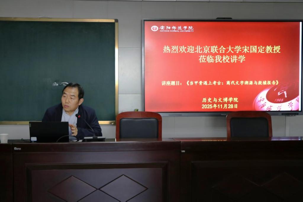 2025年11月28日上午,北京联合大学宋国定教授于文博北楼407会议室为我院师生开展《当甲骨遇上考古:商代文字溯源与殷墟报告》专题讲座。本次讲座由历史与文博学院副院长明朝方主持,师生代表参加。